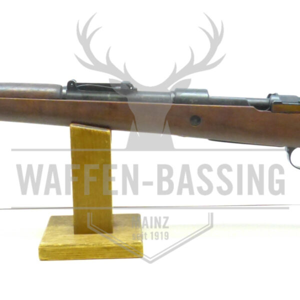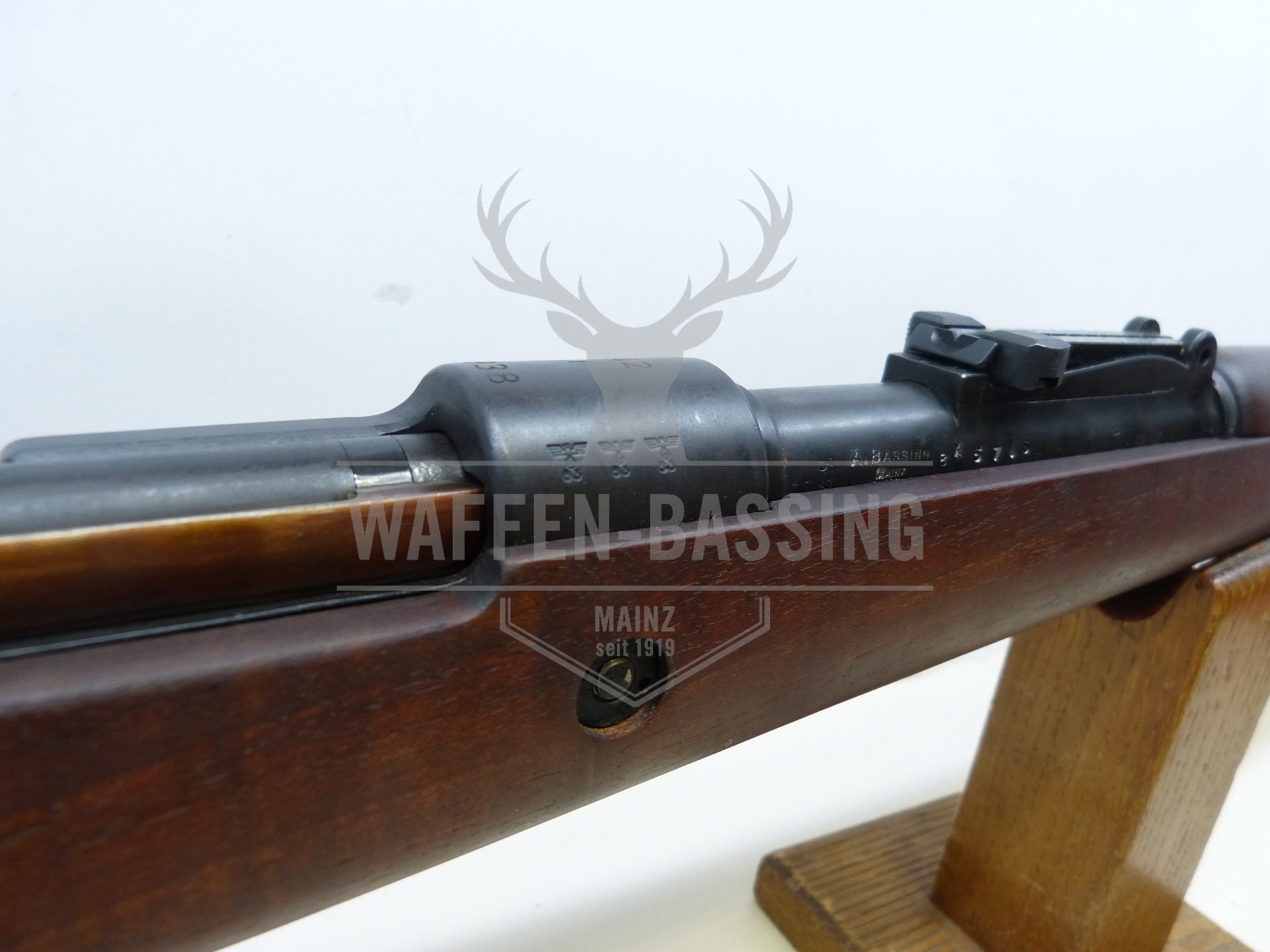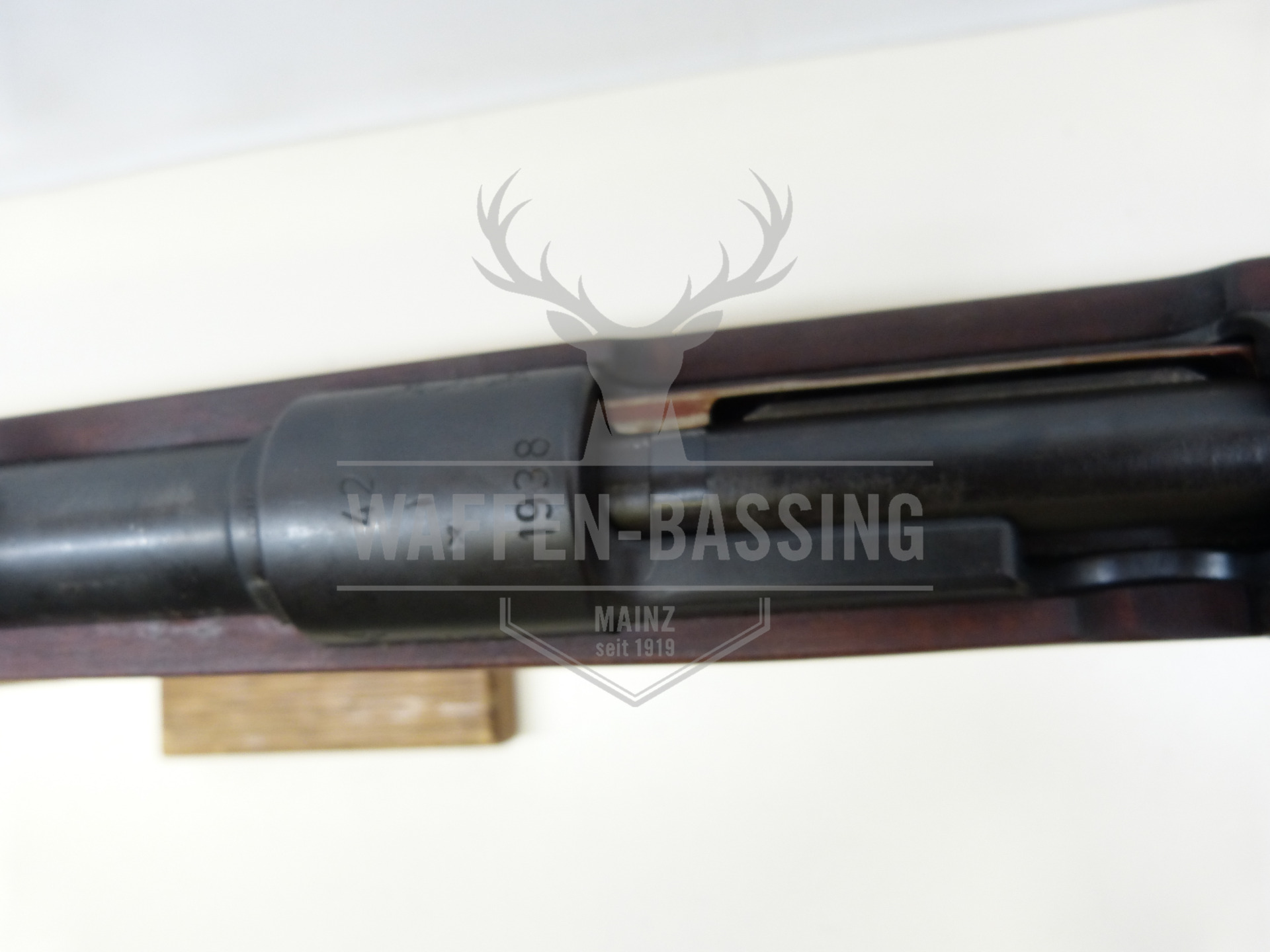 Die Repetierbüchse vom Modell K98k, gefertigt im Jahr 1938 in den Mauser-Werken AG, Oberndorf (Herstellerkennung 42) ist ein begehrtes und historisch bedeutendes Ordonnanzgewehr. Die Waffe ist bis auf die Systemschrauben und Magazinzubringer nummerngleich und trägt noch die original Stempelungen. Der Holzschaft hat als Abschluss eine Stahlschaftkappe. In der Waffe ist eine 3-Stellungs-Flügelsicherung verbaut. Der Karabiner hat einen integrierten Magazinkasten mit einer Magazinkapazität von 5 Schuss. Die Waffe hat ein Standardvisier skaliert 1-20. Der Putzstock ist nicht vorhanden. Die Ordonnanzwaffe ist mit seitlichen Trageriemenhalterungen ausgestattet und besitzt eine Aufnahmehalterung fürs Bajonett.