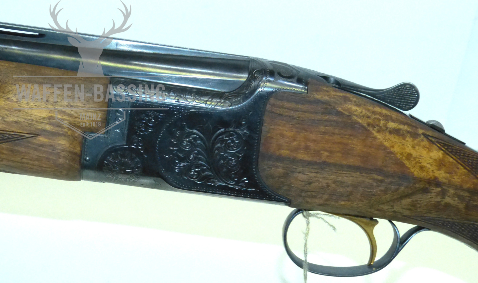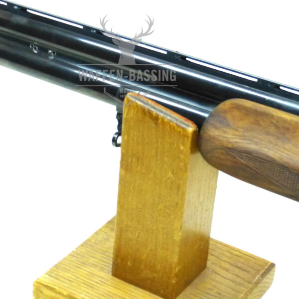 Die vorliegende Bockdoppelflinte, gebaut von dem japanischen Hersteller Miroku, besitzt das Kaliber 12/70 und ist eine Gebrauchtwaffe. Sie hat eine Gesamtlänge von 119,5cm und eine Lauflänge von 76cm. Auf den schwarz brünierten Läufen sitzt eine 15mm breite ventilierte Laufschiene mit kleinem weißen Hilfskorn und normal großem weißem Hauptkorn. Die schwarze Basküle ist aus Stahl gefertigt und mit Arabesken-Gravuren versehen. Der Einabzug ist golden ausgeführt. Weiterhin hat die Miroku Trap Bockdoppelflinte eine Schiebesicherung am Kolbenhals, die auch als Umschaltung gilt. Der Schaft der Waffe ist aus Nussbaumholz und der Vorderschaft sowie der Pistolengriff sind mit einer feinen Fischhaut versehen. Der Hinterschaft ohne Backe wird von einer 2,5cm dicken Gummischaftkappe abgeschlossen. An der Waffe befinden sich 2 Riemenbügel. Die Miroku Trap Bockdoppelflinte Kal. 12/70, Gebrauchtwaffe ist technisch einwandfrei, in einem guten Zustand erhalten und optimal für das Trapschießen geeignet.