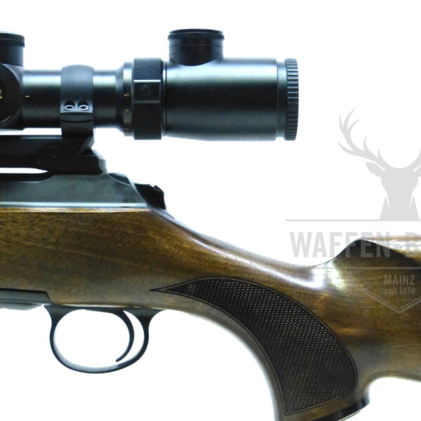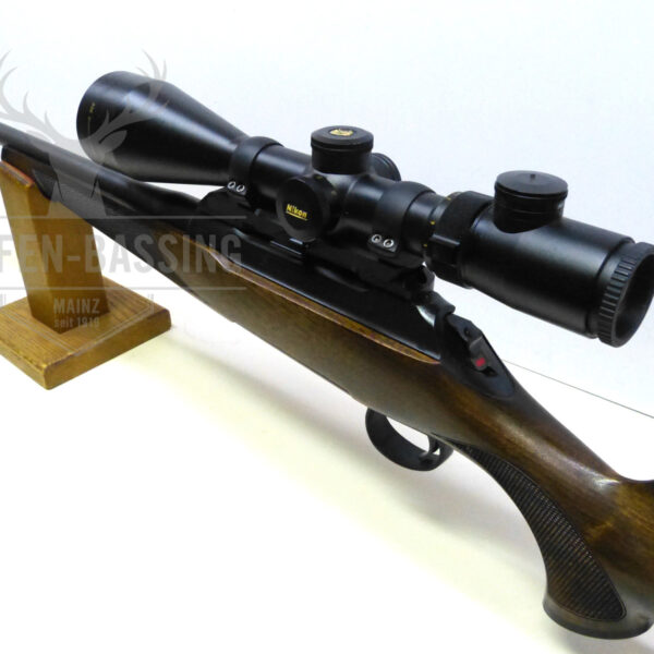 Die Sauer Repetierbüchse im Modell S101, Kal. .300Win Mag. wird als Gebrauchtwaffe angeboten. Die Gesamtlänge beträgt 112,5cm und die Lauflänge 60cm. Der Präzisionslauf ist kaltgehämmert. Der komplette Schaft der Waffe besteht aus hochwertigem Nussbaum-Maserholz mit Ölfinish und hat an Vorderschaft und Pistolengriff eine feine Fischhaut. Das Pistolengriffkäppchen, sowie die Gummischaftkappe sind original Sauer. Zusätzlich besitzt die Langwaffe einen trockenstehenden Direktabzug und eine Schlagbolzensicherung, welche leise bedienbar ist. Die Sauer Repetierbüchse Mod. S101 wird des Weiteren mit dem Zielfernrohr Nikon Monarch UCC mit der Vergrößerung 2,5-10×56 mitgeliefert. Das Zielfernrohr hat das Absehen 4 und ist an einer Dentler Montage angebracht